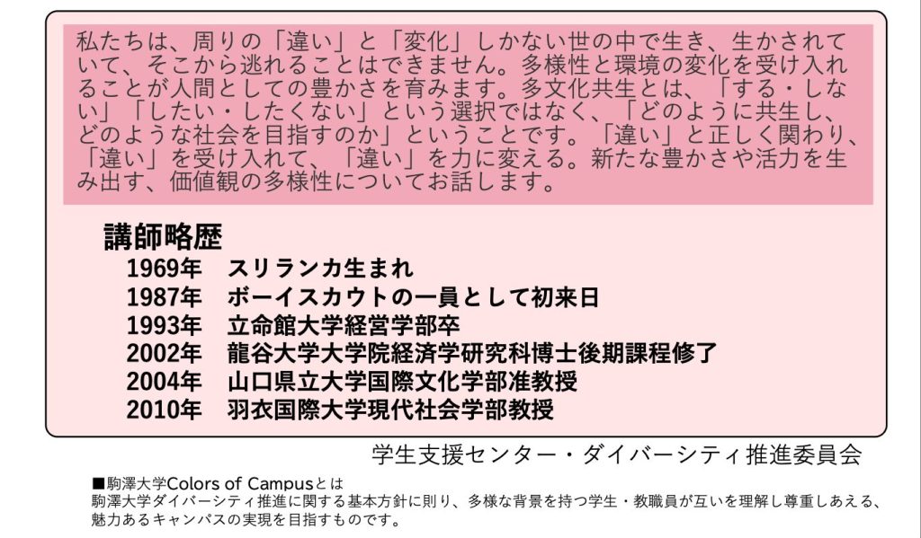 key words: ダイバーシティ月間/ダイバーシティ週間/ダイバーシティ講演/ダイバーシティ講演講師/ダイバーシティスピーカー/多文化共生講演/人権講演/大学講演/駒澤大学/にしゃんた